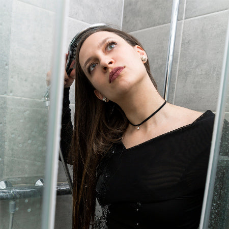 22 photos of a formally dressed model washing her hair